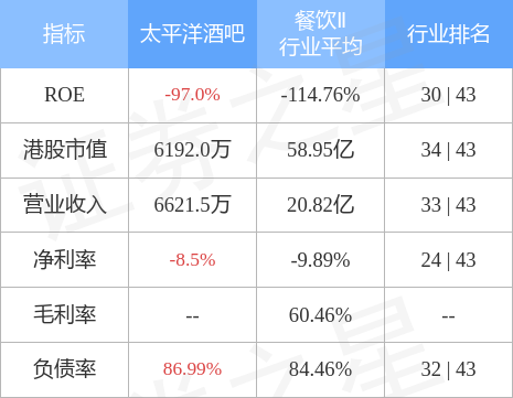 太平洋酒吧港股市值6192万港元,在餐饮Ⅱ行业中排名第34。主要指标见下表: